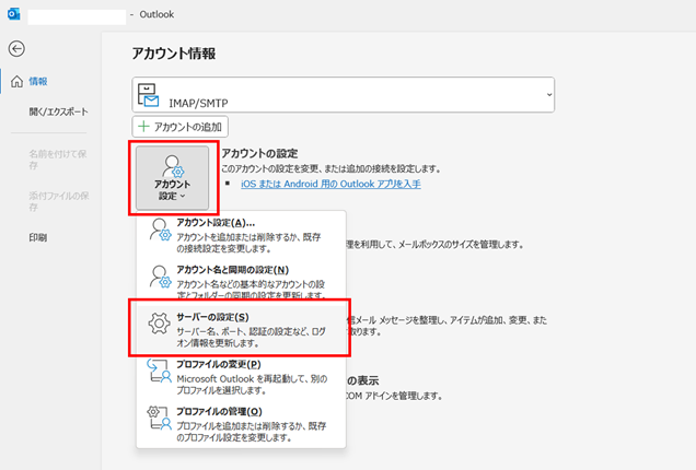 [アカウントの設定] > [サーバーの設定(S)]の順にクリックします。