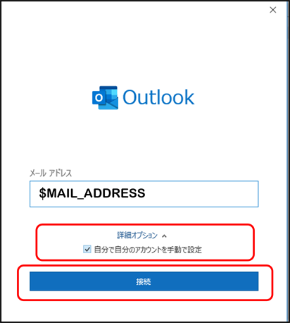メールアカウントを入力し、[詳細オプション]をクリックし、[自分で自分のアカウントを手動で設定]にチェックを入れ、[接続]をクリックします。