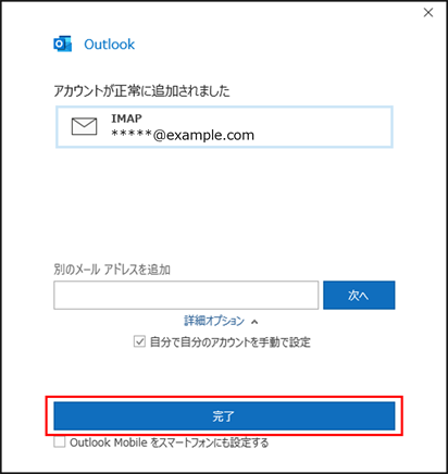 セットアップの完了画面で、他のアカウント追加はしない場合、[完了]をクリックします。以上で設定完了となります。
