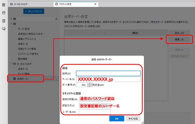 メールアドレス下の【送信サーバー】を選択し、【編集】をクリックすると送信サーバーの設定が表示されますので、サーバー名、ポート番号、接続の保護、認証方式をご確認ください。
