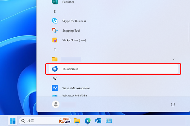 デスクトップ上に作成された【Thuderbird】のリンク、または画面左下の【スタート】ボタン→すべて→ 【Thunderbird】の順にクリックしプログラムを起動します。
