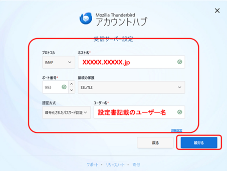 受信サーバーを設定します。以下のように入力し、【続ける】をクリックします。