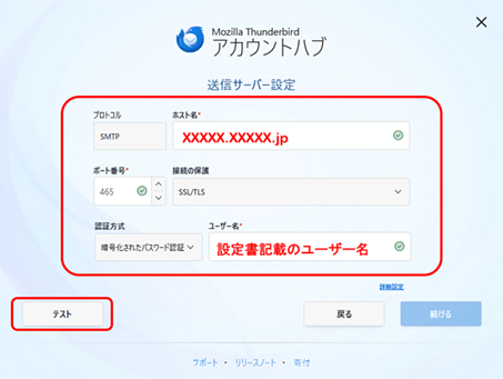 送信サーバーを設定します。以下の表を参照して各項目を設定し【テスト】をクリックします。