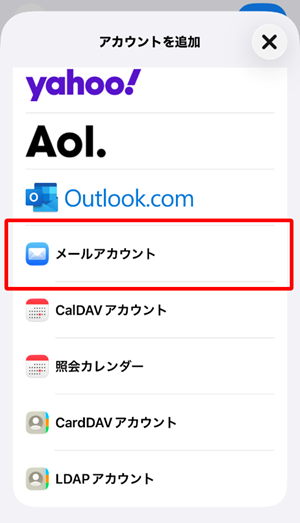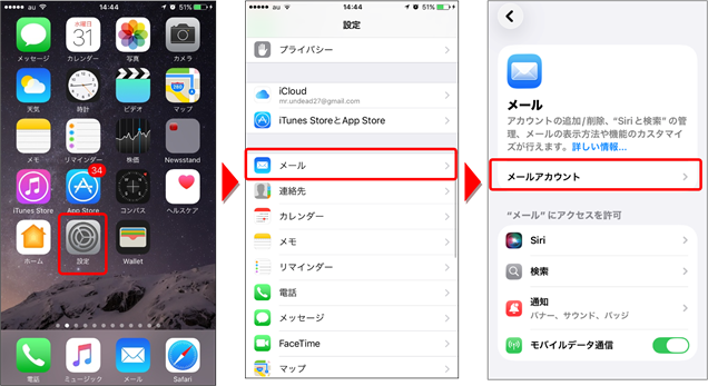 ・【設定→アプリ→メール】より、【メールアカウント】をタップ